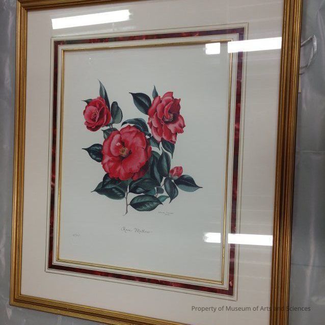 A set of flowers lay in the center of a white background. In the center there is one large redish pink flower accompanied by two slightly smaller flowers and a small bud in the right lower corner of the flower arrangment. There are also several dark green leaves with in the grouping.Collection