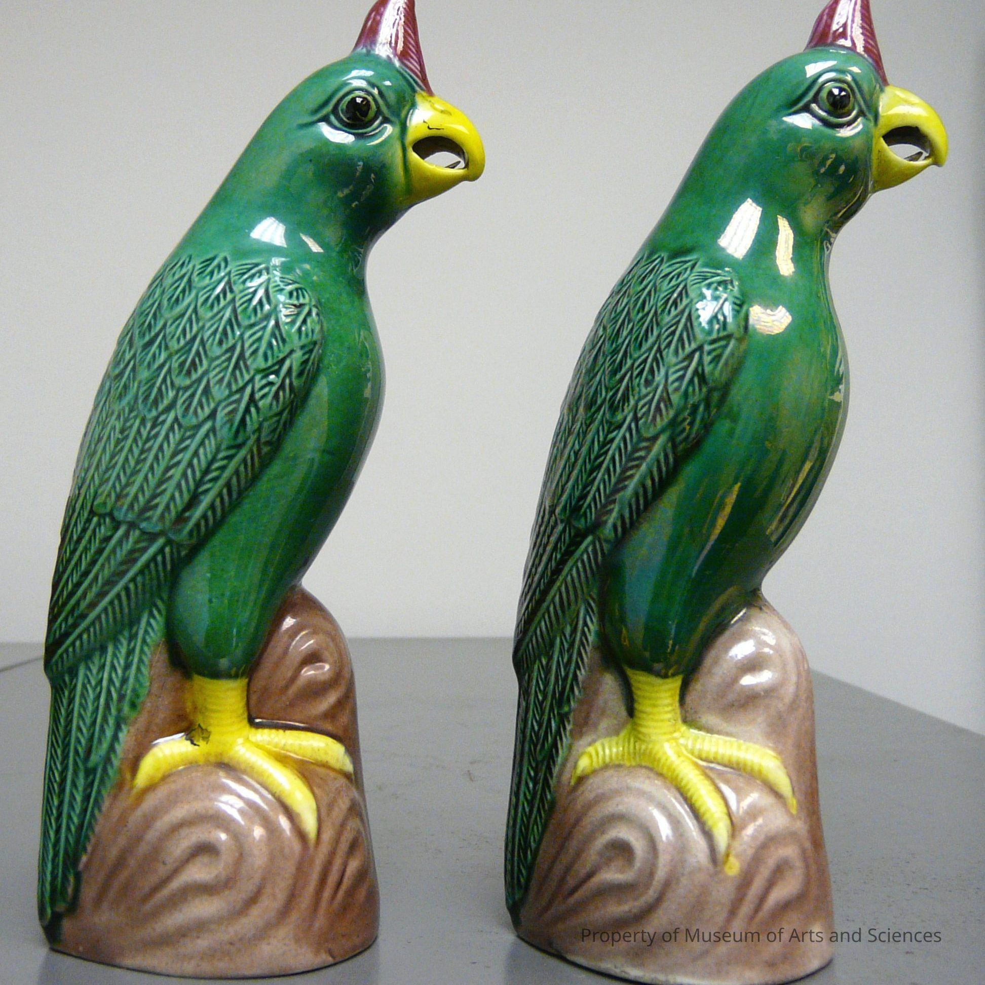 Parrots have a green glaze with yellow beaks and feet; they stand on a brown glazed round form with swirls, resembling a rock or stump of a tree; export for mass marketCollection