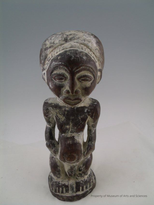 Figure has detailed hair and is wearing a hat. Abdominal region is pronounced. Arms are at side with hands resting on abdomen. Facial features are voluminous. Lips are heart shaped. Grid like pattern across chin (could be beard). Belly button and penis are pronounced. Figure has simply carved fingers and toes, figure is covered in white substance that rubs off with light.Collection