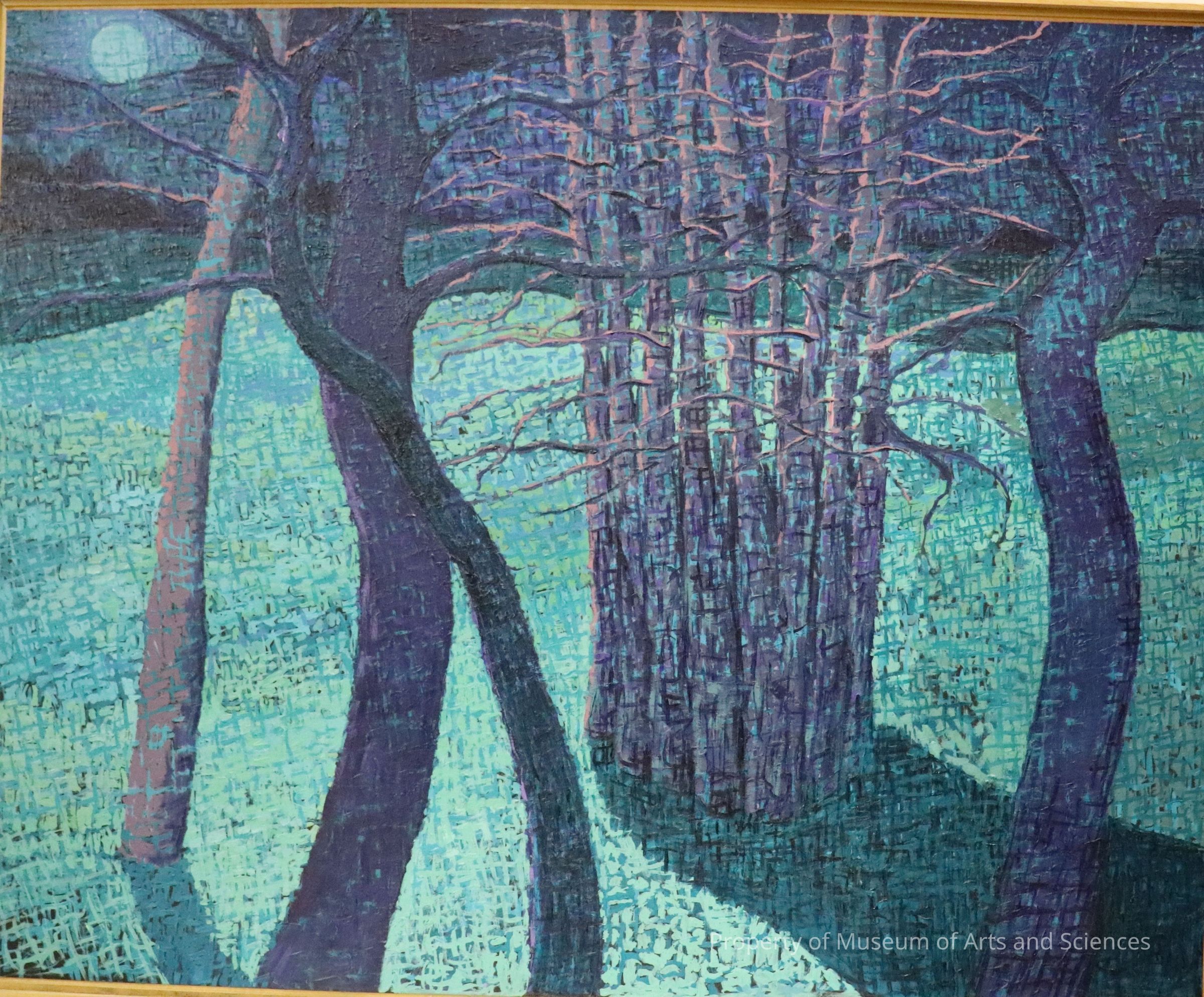 Landscape scene of trees in shadow. Cool grays, blues. Moonlit.Acquisition