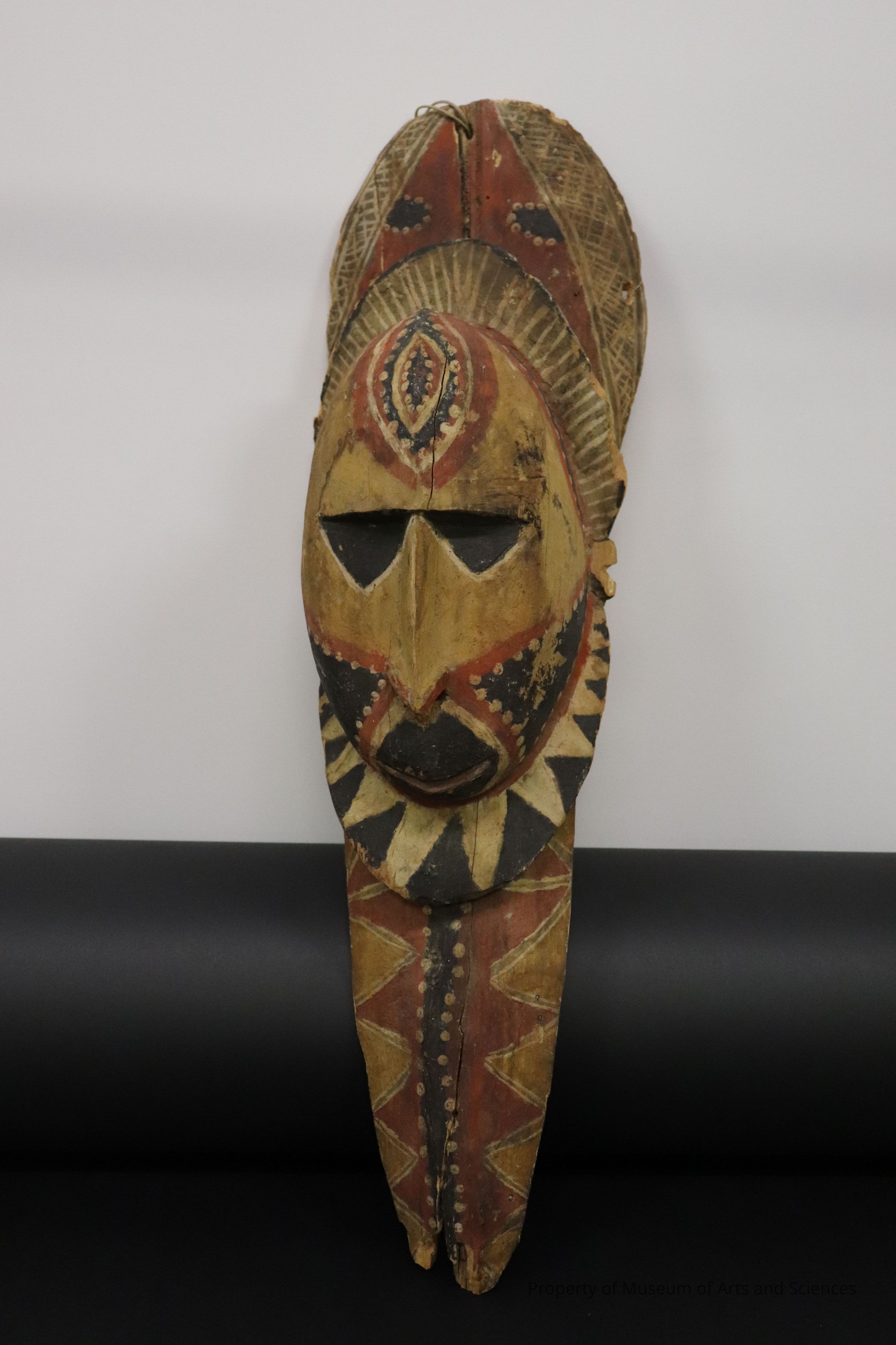 Wooden head on long oval plaque-painted and strung through nose and ears, paint colors mainly yellow, and black, flat on backsideback