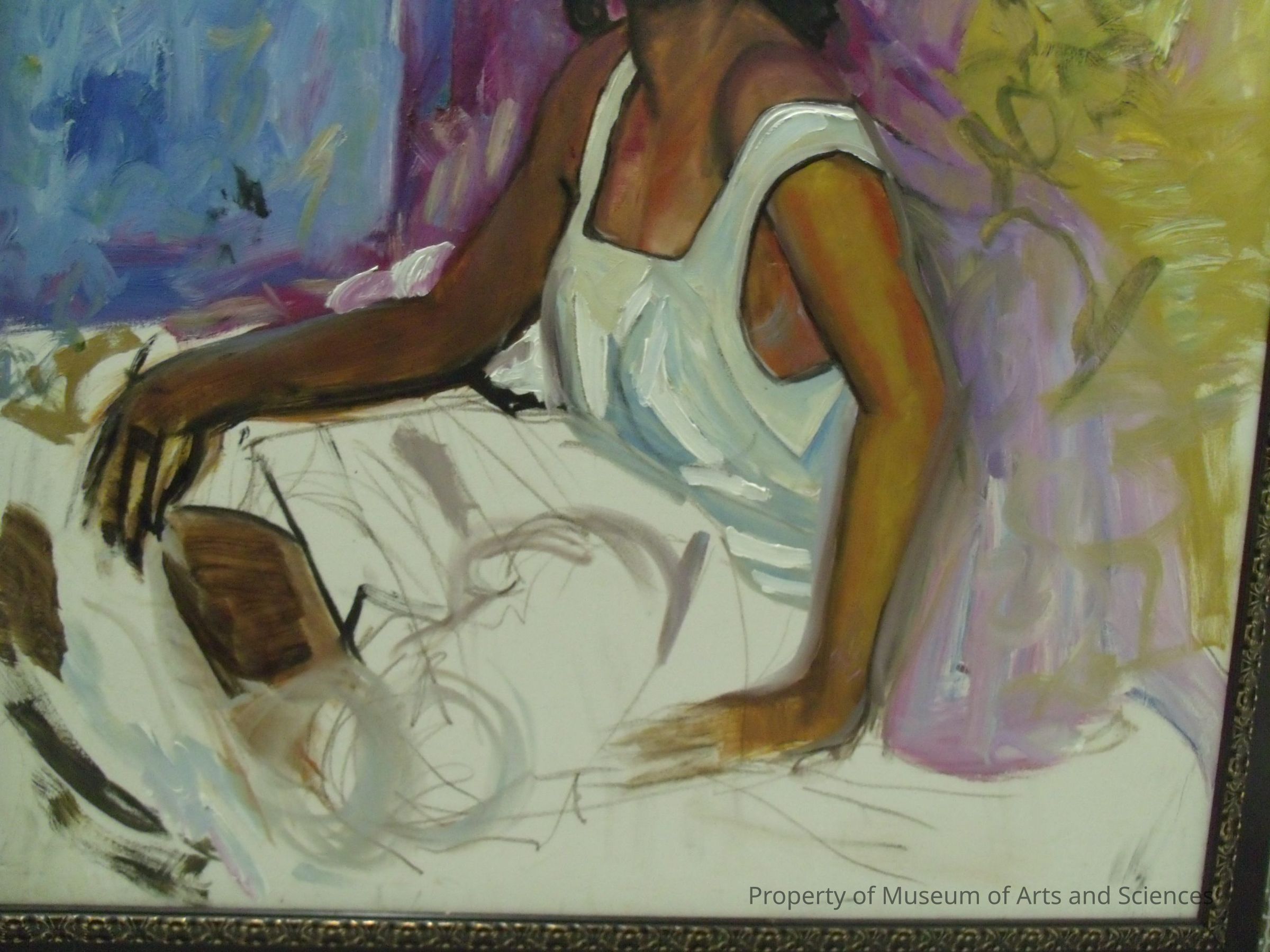 Images is of a women clothed in white on a pastel background of blue, purple, and yellow.Artwork Details