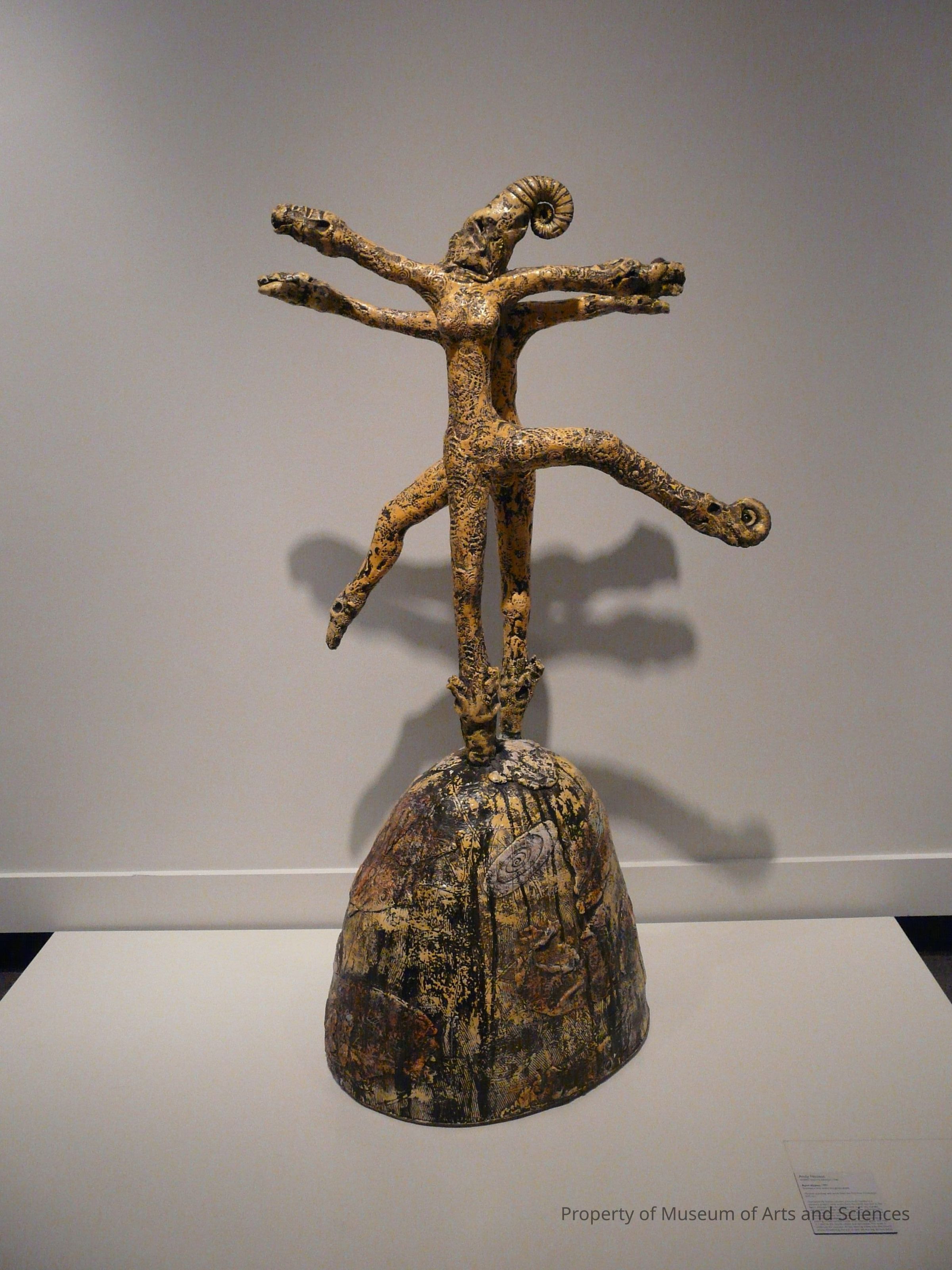 Internationally known ceramic artist Andy Nasisse is a visionary sculptor who works from the inside out, that is, the figure emerges from his subconscious as the clay changes and transforms under the touch of a master technician. The multiple layering of matte and glossy glazes create a surface energy and tension that contributes to the overall tension of the work. Apocalyso depicts a male and female figure dancing on the northern pole of an elliptical globe. The title is a play on the words calypso and apocalypse. The artist is exploring the concept of man dancing madly over the natural world, threatening the end of time yet dancing the last dance.