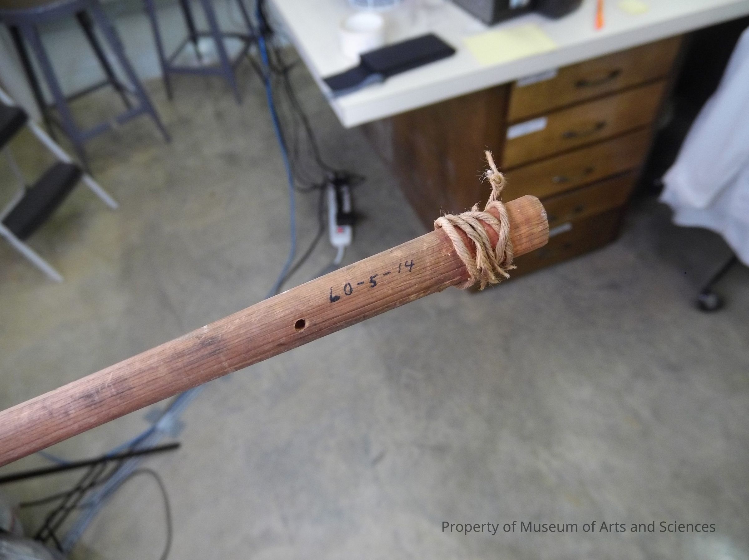 Harpon, single barbed bone point tied to shaft- shaft notched at opposite end and once had feathers