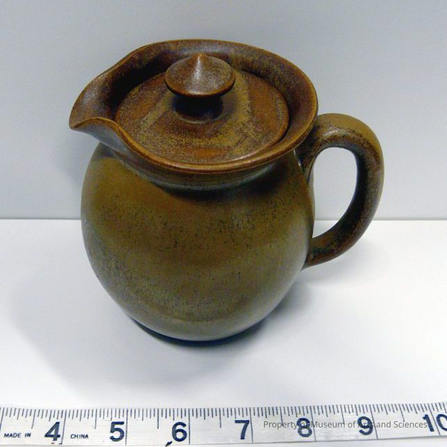 Functional stoneware with Mountain Gold glaze; brown/black color; stamped on bottom