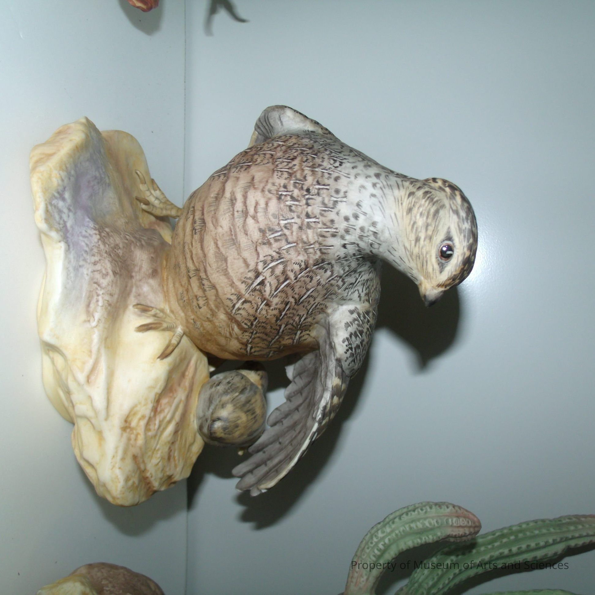 The quail has her proper left wing outstretched to shelter one chich with a second chick behind her at her proper right foot. Her head is turned to her proper left. The group stands on a beige and lavender rock and ground. The work is stamped on the baseCollection