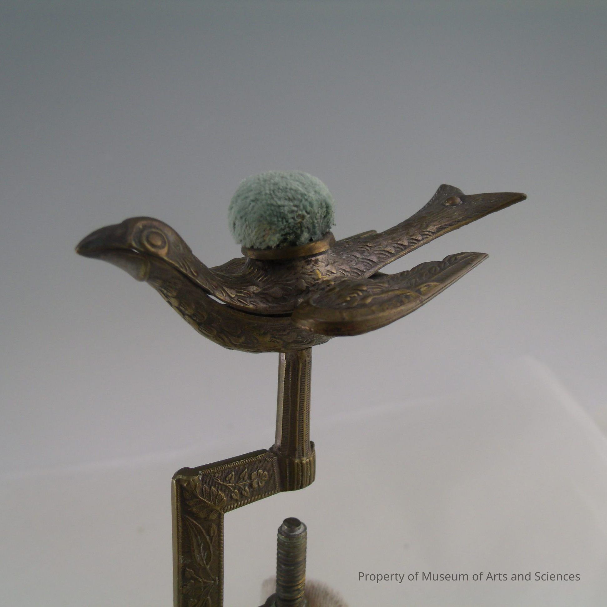 Brass bird sewing clamp- could attach to a table- help keep thread straight by running it through the birds beak/ On top of bird ornamenitation is a small round (turquise needle cusion)Collection