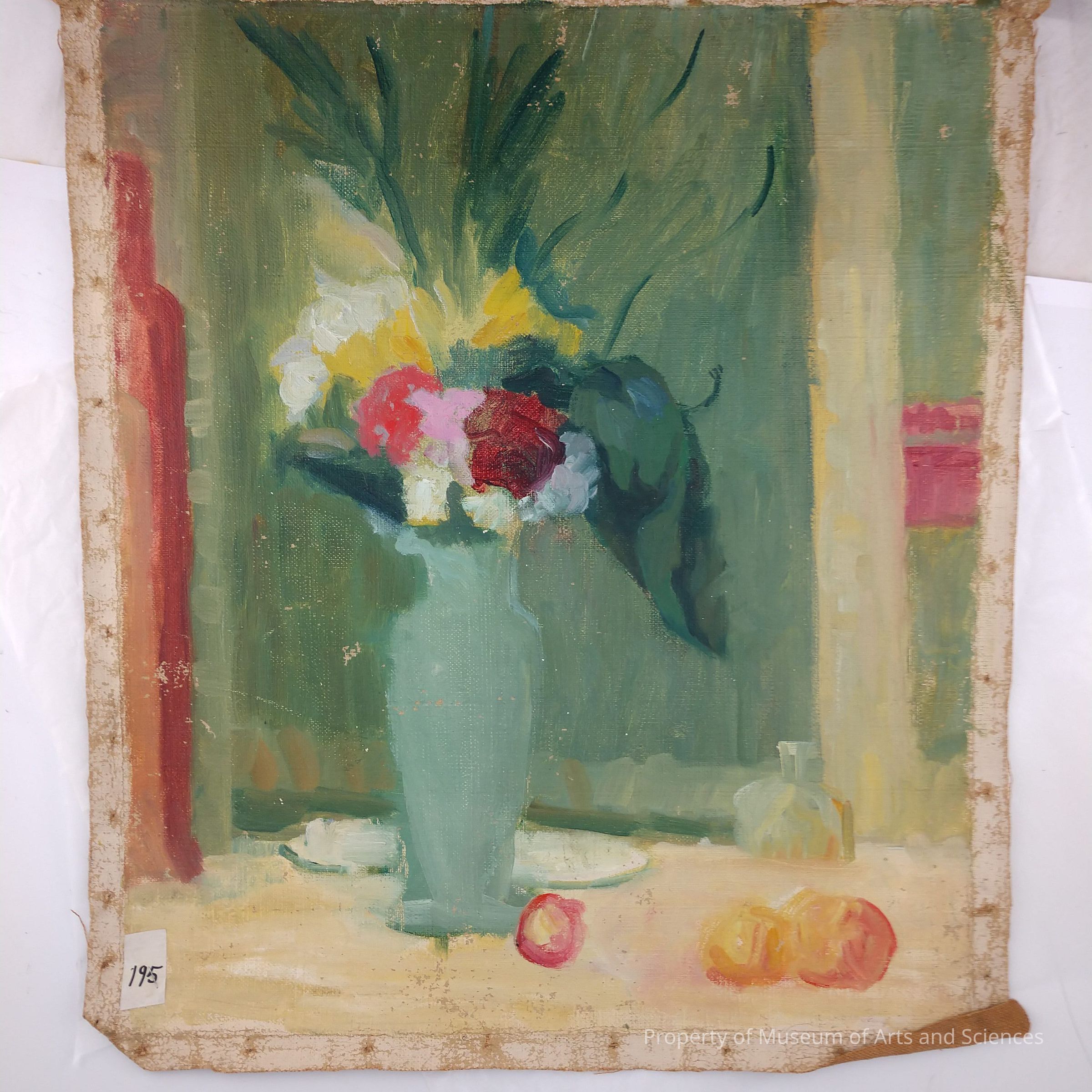 Green Vase holding- yellow, red, and pink flowers- other objects are scattered on the tabletop and background is flat green.Artwork Details
