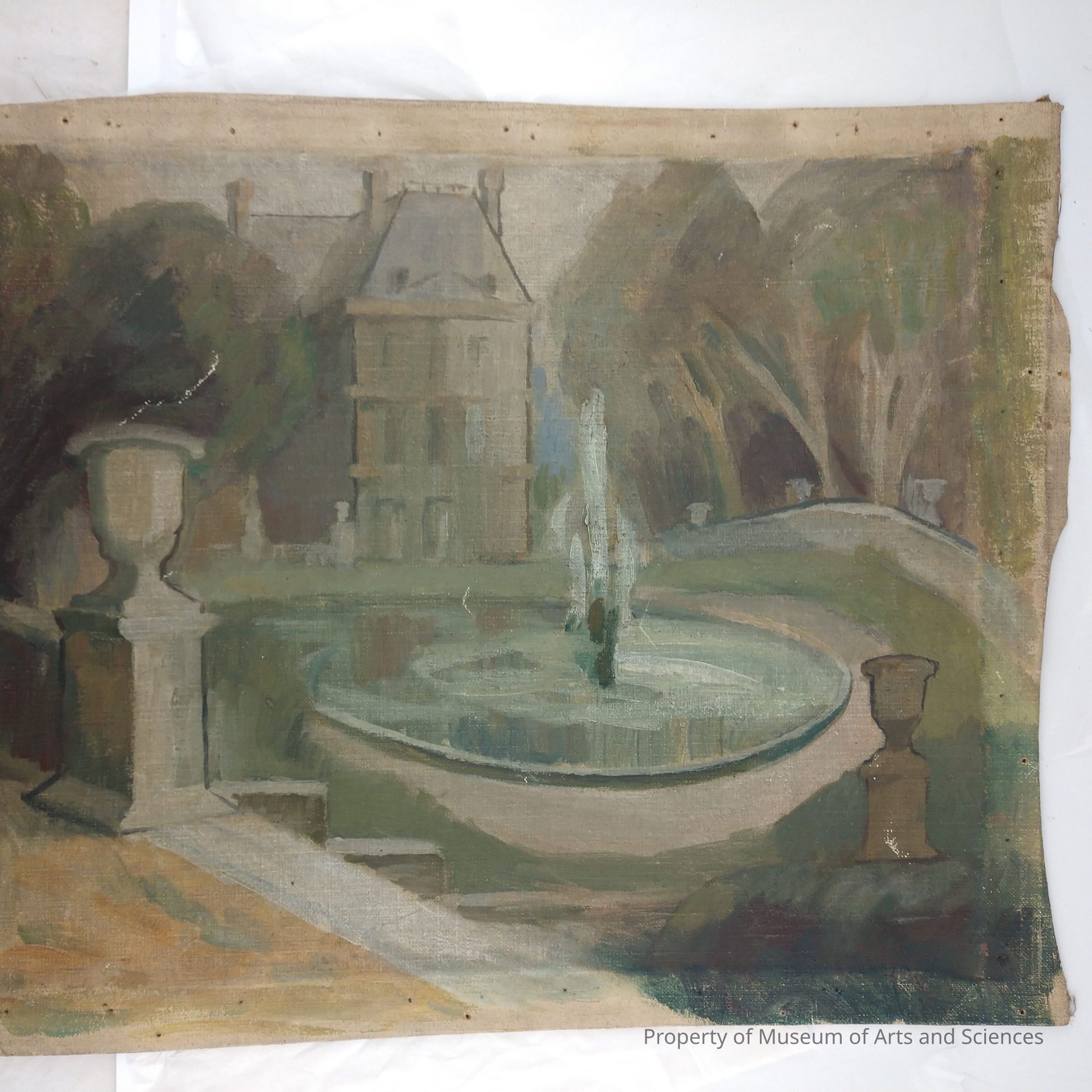 View thru gates of large french manor house with circular fountain and pool in forgroundCollection