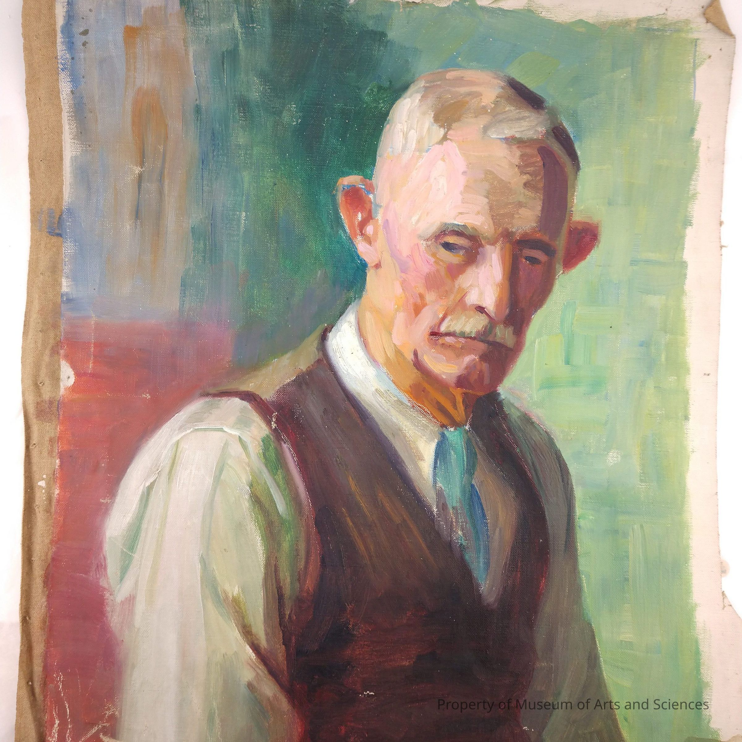 Head to waist portrait of man with brown vest, blue tie Note- Charleston Group