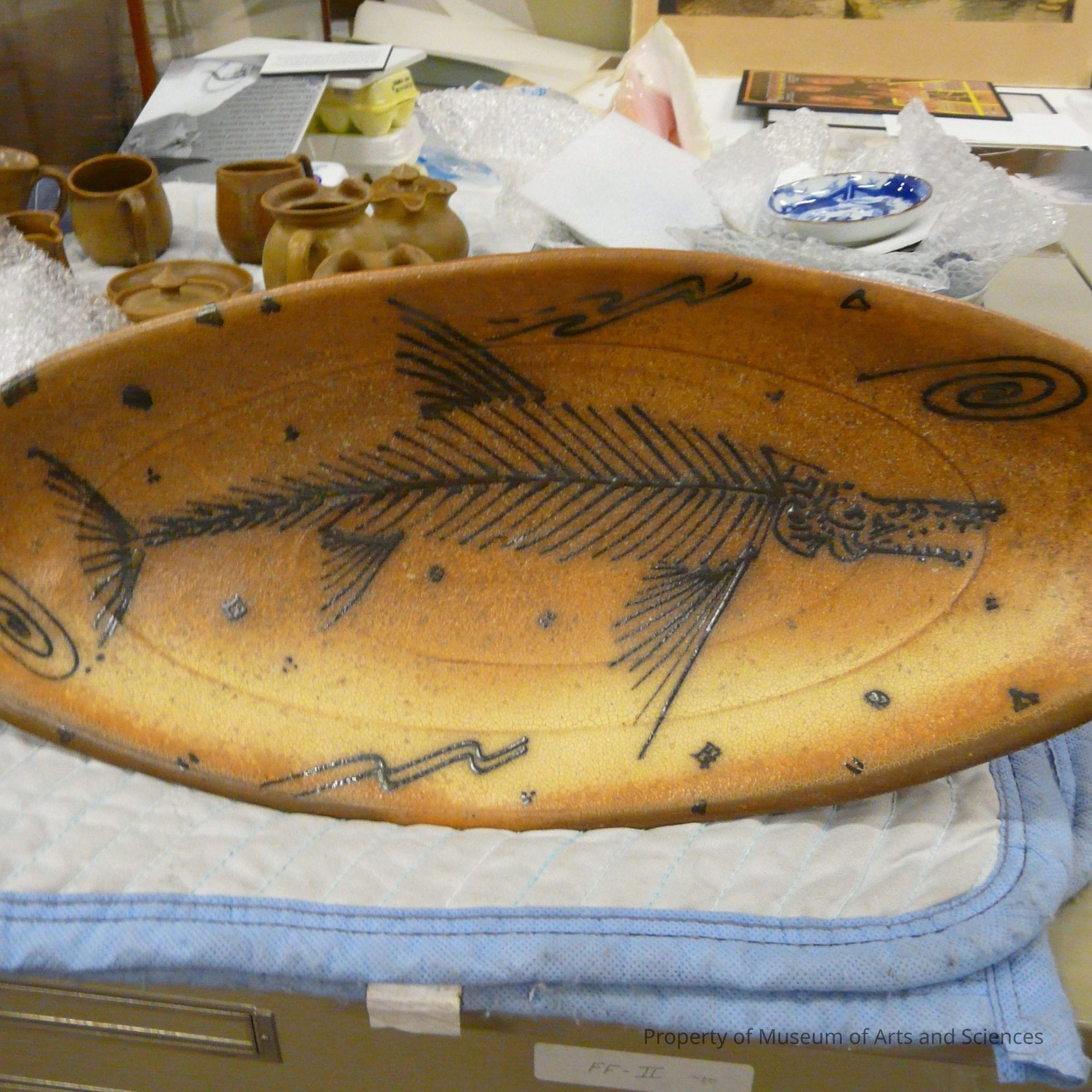Oval clay platter is decorated with a drawing of a fish skeleton and spirals and dotsCollection