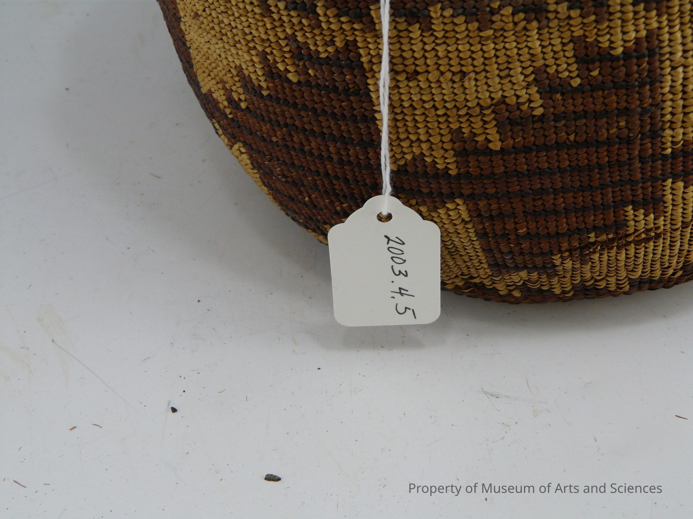 This basket has a circular shape. The basket is constructed of tule and dyed tule cordage in contrasting shades of brown in a geometric design; some motifs are quilled. The Klamath/Modoc Indians lived near the California/Oregon borderCollection