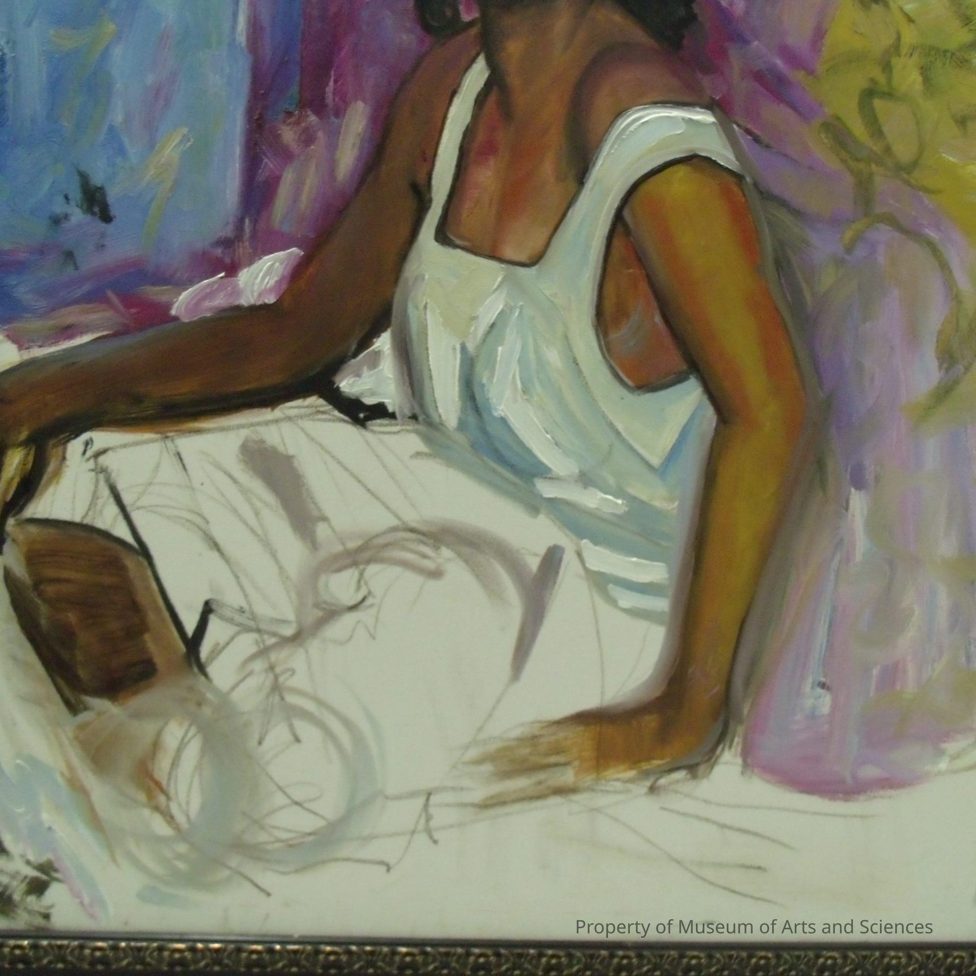 Images is of a women clothed in white on a pastel background of blue, purple, and yellow.Artwork Details