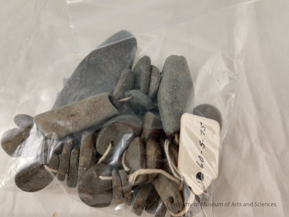 Steatite, smooth and drilled on string- small asymetrical (58), tubular (6) unstrung-3 fragments, 1 tablet oval