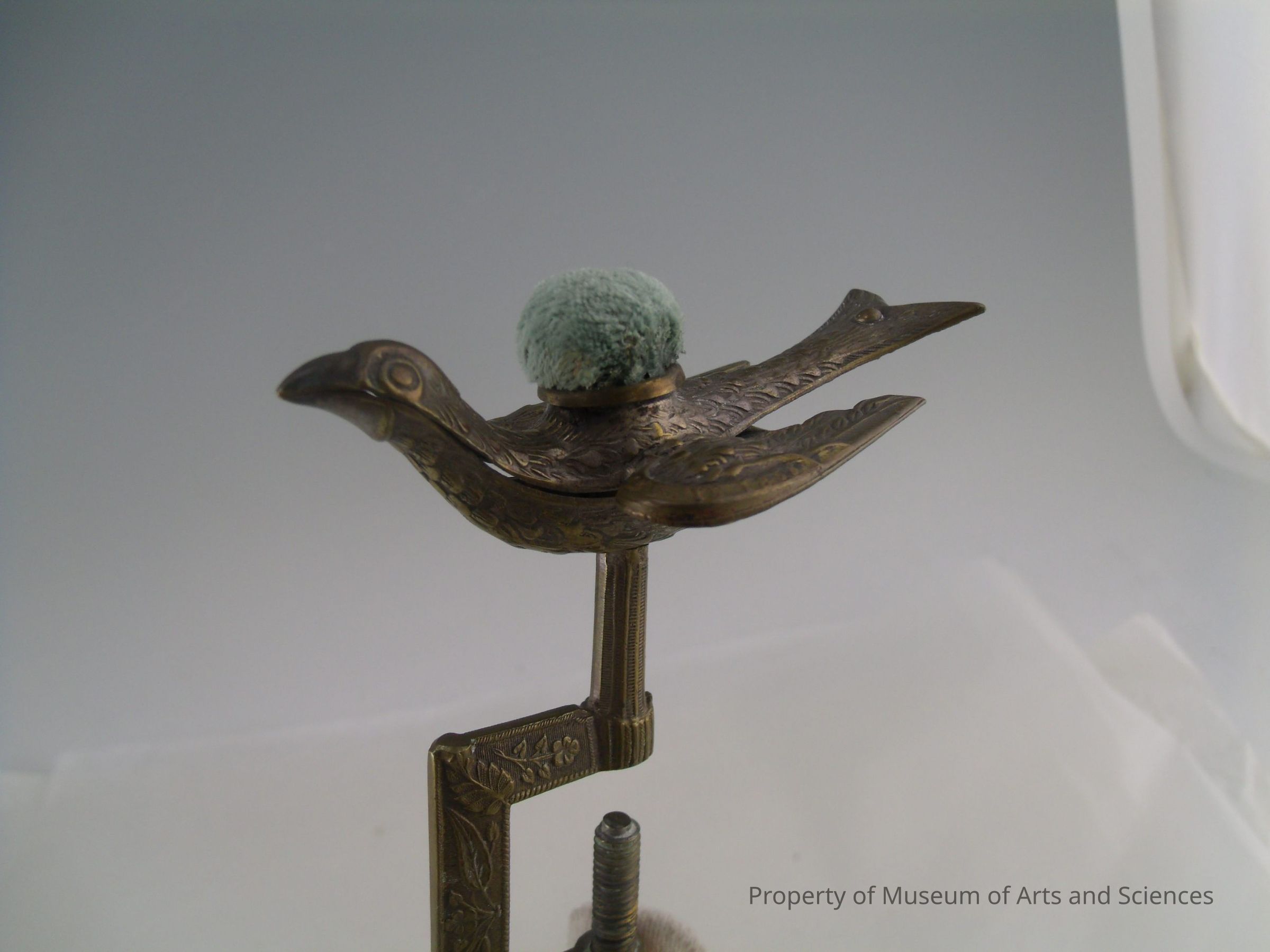 Brass bird sewing clamp- could attach to a table- help keep thread straight by running it through the birds beak/ On top of bird ornamenitation is a small round (turquise needle cusion)Collection