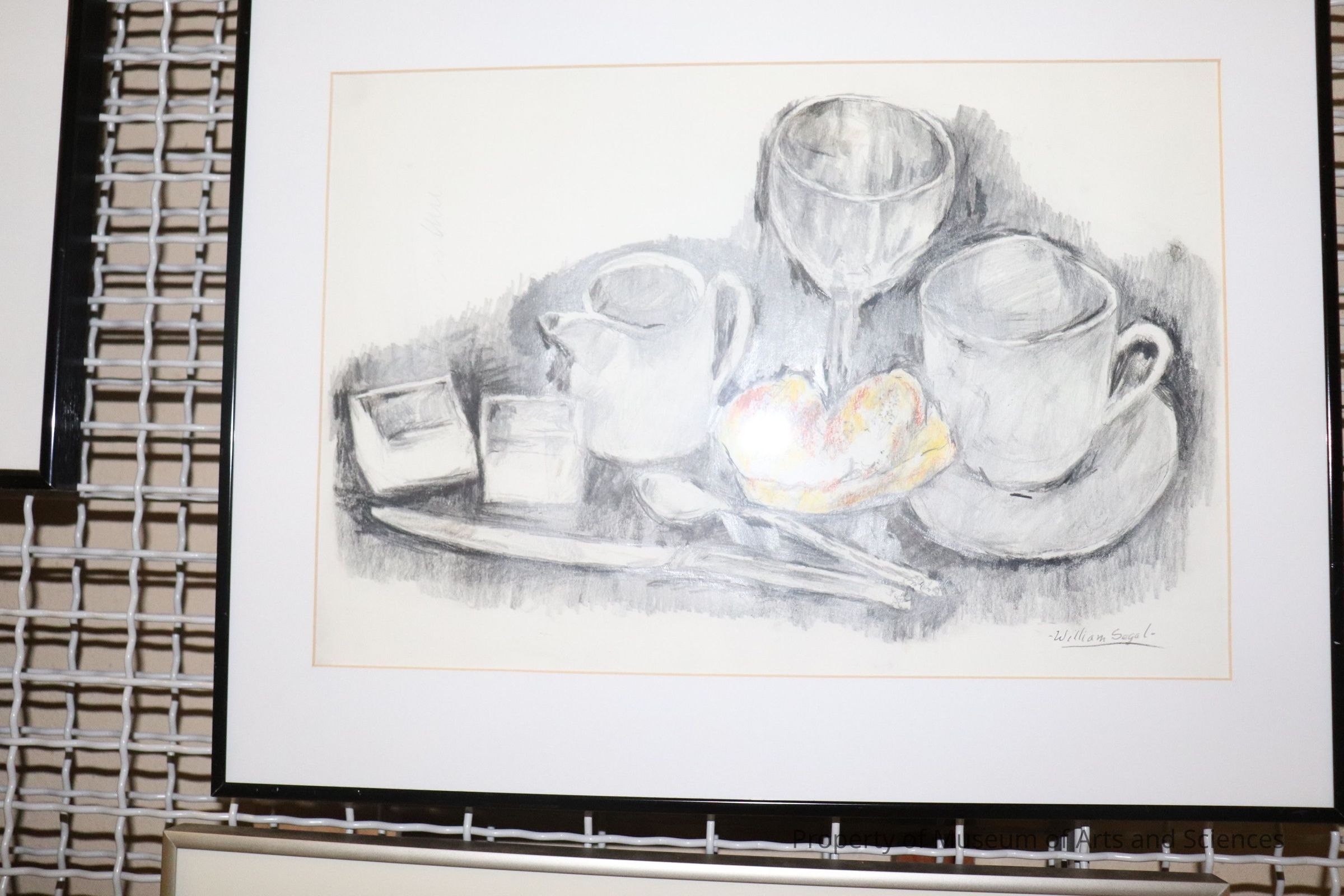 Still life study of breakfast table rendered mostly in graphite with accents of color on central croissant or roll. Segal again is not particularly affected by exact measurement or realism but more of focusing on certain area and aspects of his subject like the perspective og the vessels and the center of composition.Artwork Details