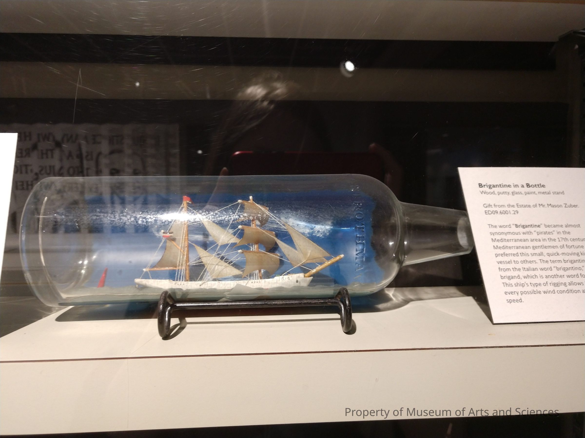 Two-mast ship with white hull "floats"on grey modeling clay "water"inside glass bottle; side of bottle behind ship is painted blue; bottle rests on a curved metal stand.Collection