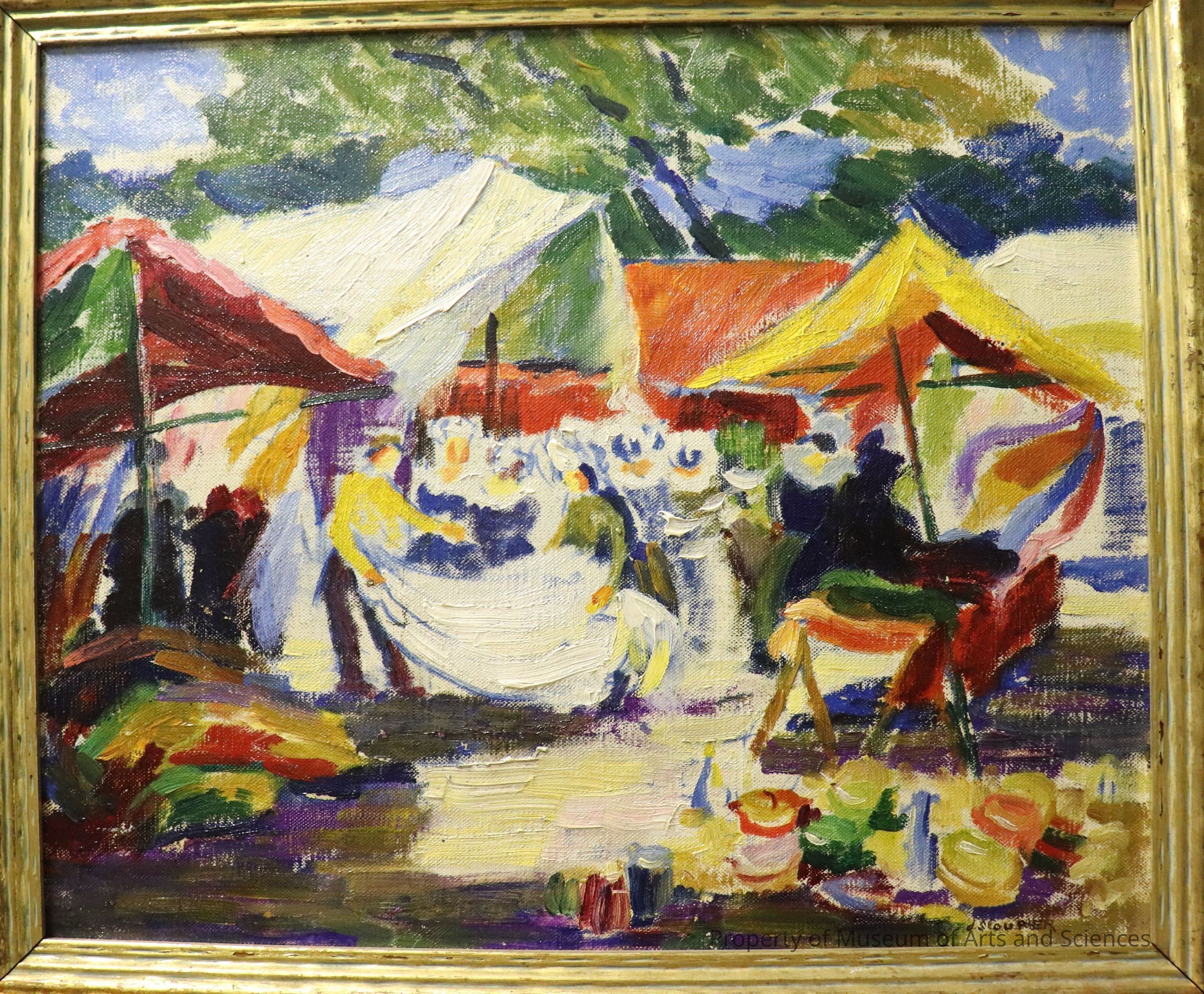 Market scene in France with bright tents and lots of sunshine.Collection