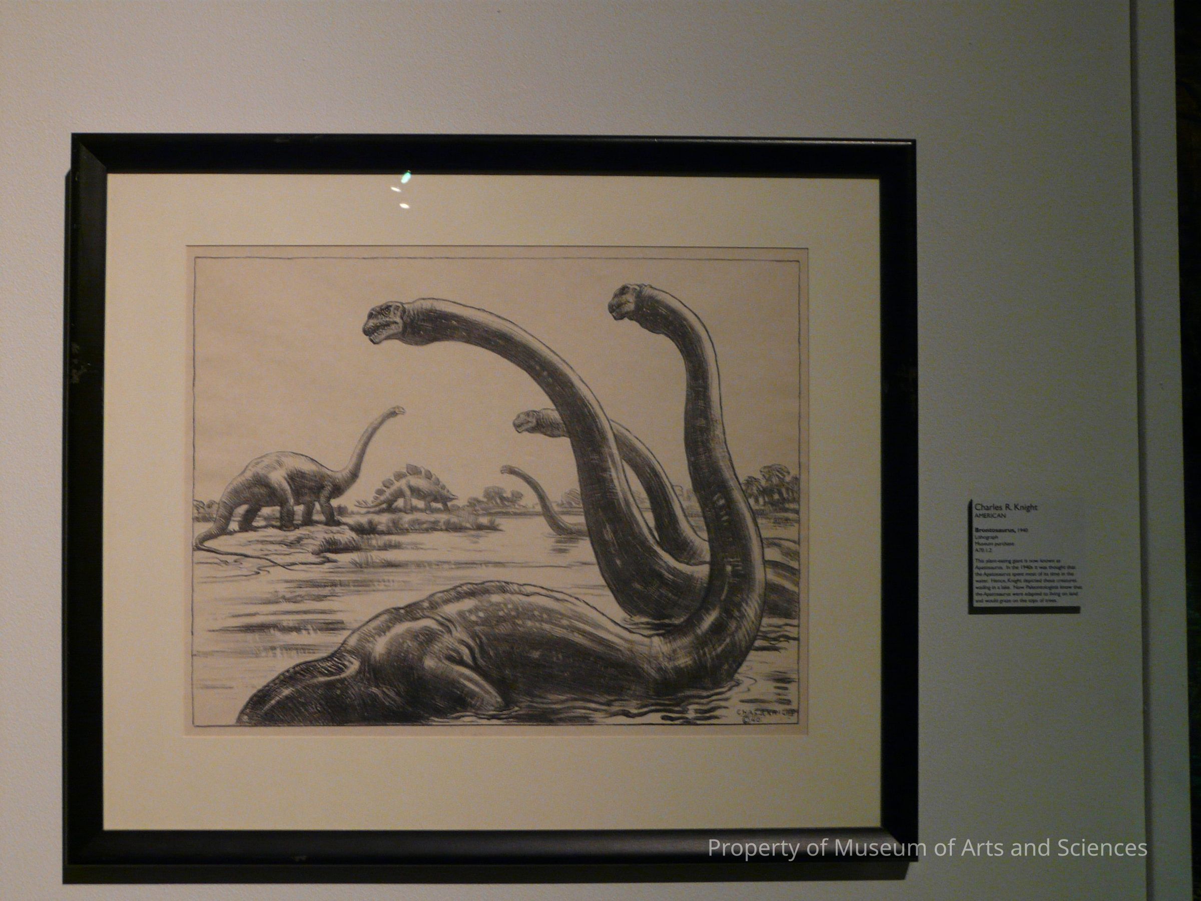 This plant-eating giant is now known as Apatosaurus. In the 1940s it was thought that the Apatosaurus spent most of its time in the water. Hence, Knight depicted these creatures wading in a lake. Now Paleontologists know that the Apatosaurus were adapted to living on land and would graze on the tops of trees.Collection