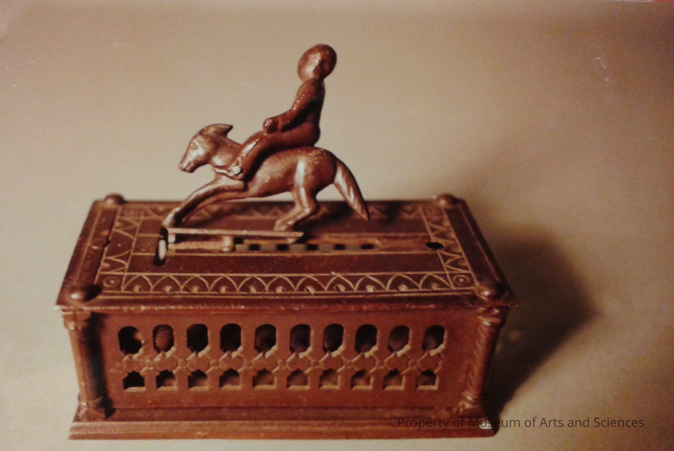 Put a penny in the slot, release the donkey, and it will throw the man over it's head, knocking the penny into the bank.Collection