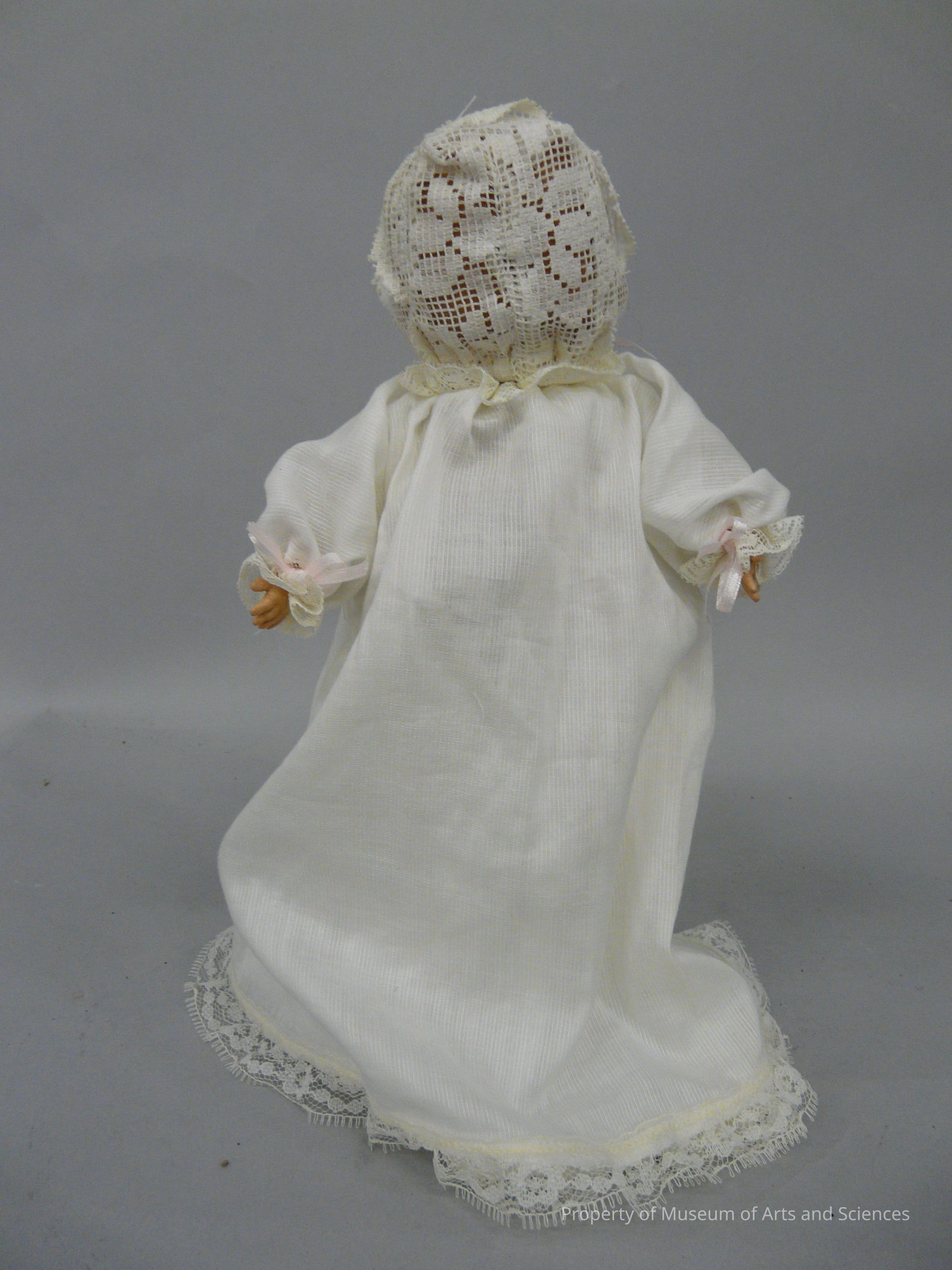 This is an Armand Marseille Bye-Lo Baby Doll. The bisque china head has an open mouth with two lower teeth. The face has rosy cheeks and fixed blue eyes. The back of the doll's head is marked "AM Germany and 351." The doll's head has molded hair.