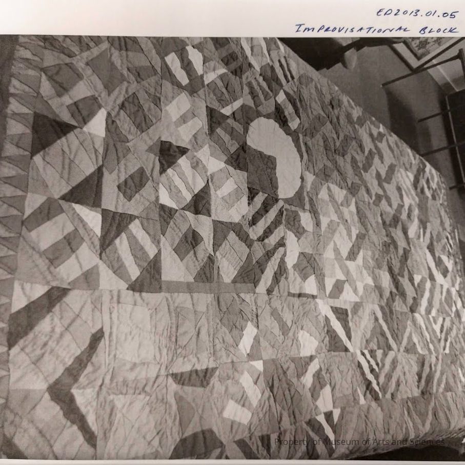 Multi- colored improvisational block design with olive green backing Top- Oglethorpe Co.; quilted by Roy Ward