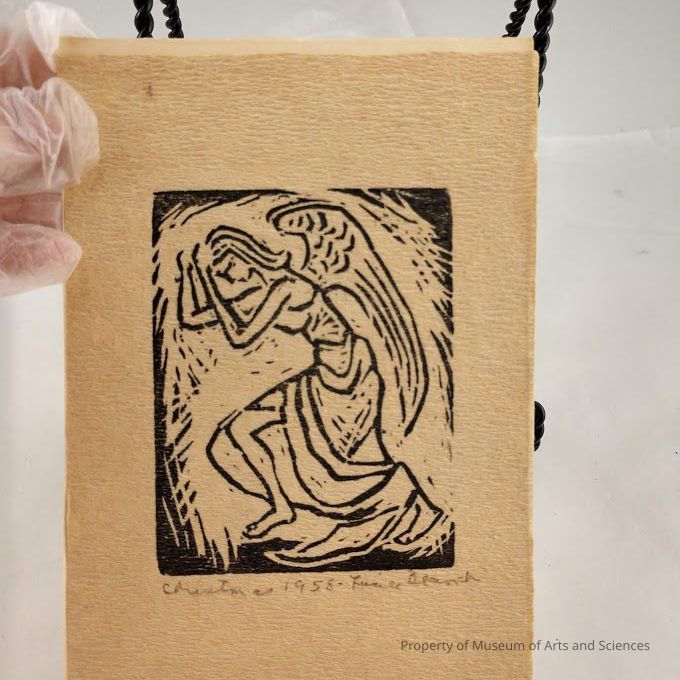 Black ink woodblock print, rectangular of angel bending over to the left with both hands at forehead