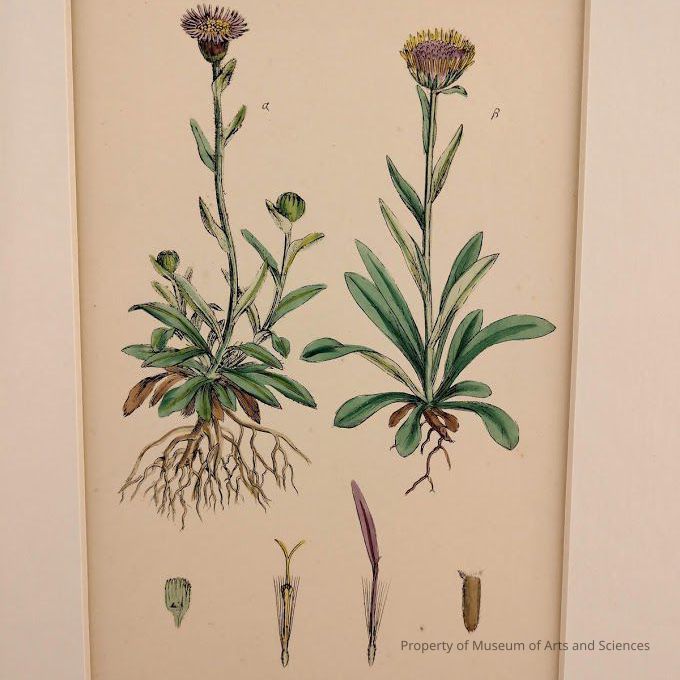 Picture of plant with root system on left and right. Below are the four drawings showing the various parts of the flower. Colors are lavender, yellow, green, and brown.Artwork Details