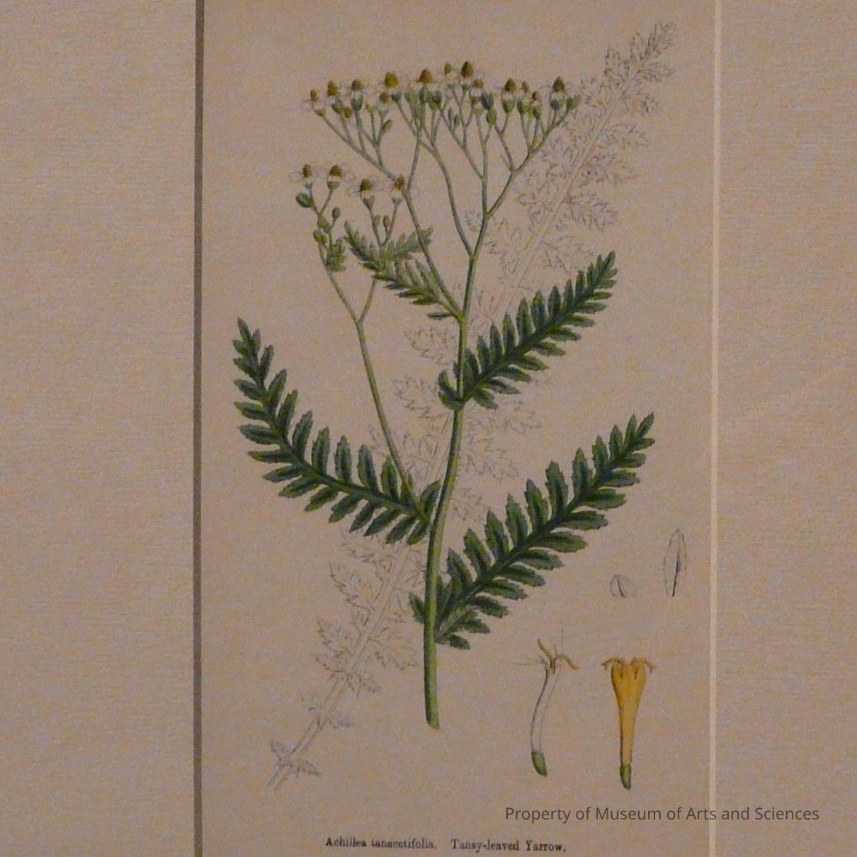 There is a central drawing of them stem, leaves and yellow and white blossoms. Behind this a line drawing of the leaf. At the bottom right are four small drawings of flower parts.Artwork Details