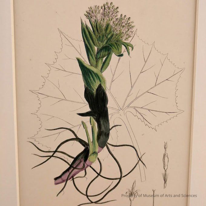 Central hand-colored picture of plant with root sytem; sketches of opened leaf and three flower parts in the background and to the right. Flower is white and green; roots are lavender and dark green.Artwork Details