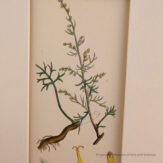 Central hand-colored picture of green plant with root system and flowering plant with root system. Below are three pictures of flower parts. The flowers are yellow.Artwork Details