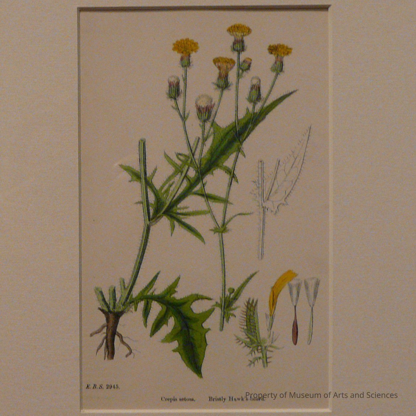 Central picture of green stem and leaves with buds and flowers in yellow, white, and lavender in the foreground. There is a line drawing of the leaf and stem at the right. There are four smaller drawings of flower parts at the bottom.Artwork Details