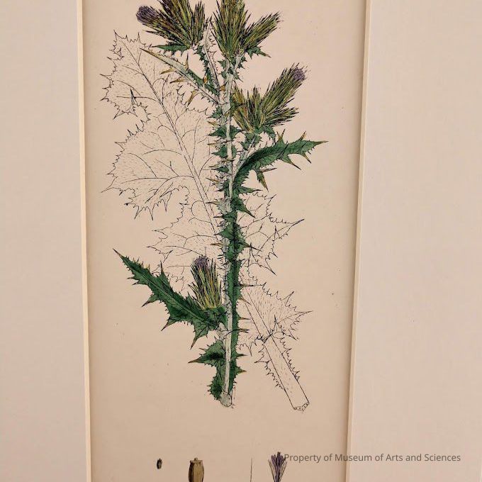 A central picture of the flower, leaves, and stem in greens with purple flower. Behind is a line drawing of the leaf. Below are three pictures of the flower parts.Artwork Details