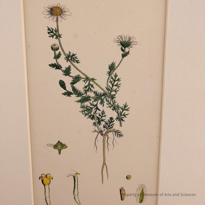 Central picture of plant showing bud, flower, stem, leaves and roots; flower is yellow and white. Below are six drawings of the parts of the flower.Artwork Details