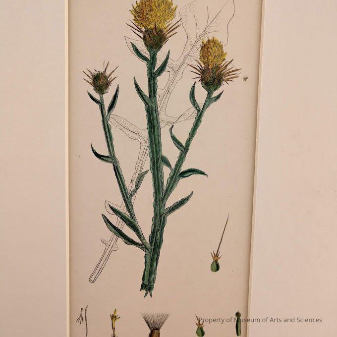 Central drawing of bud, flowers, leaves and stem; floewrs are yellow. Behind is a line drawing of a leaf. Below are six drawings of flower parts.Artwork Details