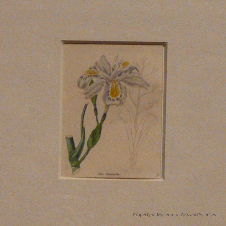 At left is colored drawing of yellow and white iris blossom on green stem. Behind and the right is a line drawing of the stem and leaves. This is one of four cut from the same page of the book.Artwork Details