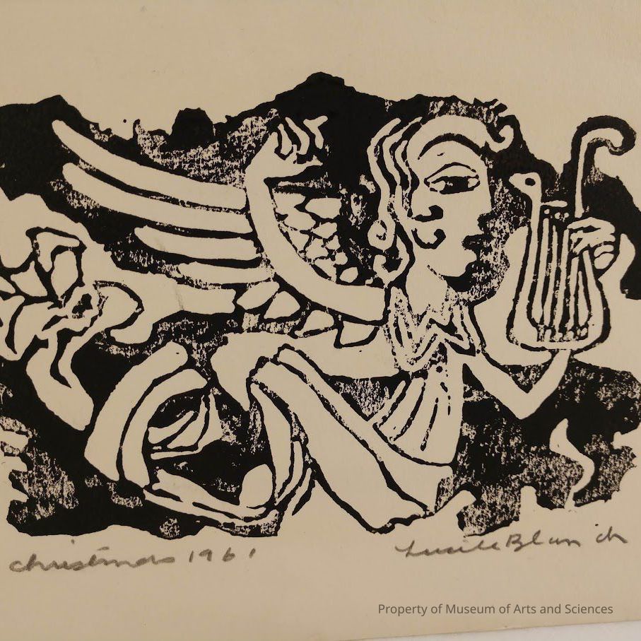Central image of angel w/wing and swirling robes, facing to (R); (R) arm extended, (L) arm holding harp; B and W on cream paperCollection