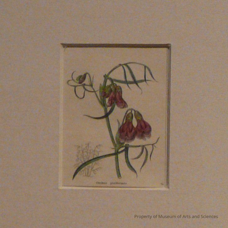 There is a central drawing of the dark purple blossoms on a green stem with some leaves. To the lower left is a line drawing of the plant. This is cut from a page with four similarly sized drawings.Collection