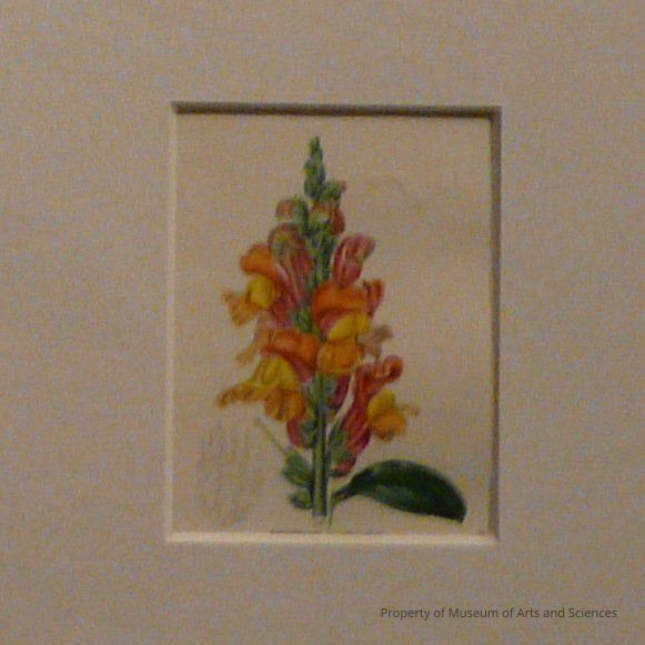 There is a central drawing of the multi-colored red, yellow, orange and pink blossoms on a green stem with some leaves. To the lower left is a line drawing of the full plant. This is cut from a page with four similarly sized drawings.Artwork Details