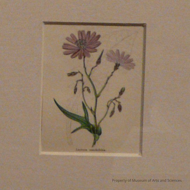 There is a central drawing of the light purple blossoms and buds on a green stem with some leaves. Behind is a line drawing of the full plant. This is cut from a page with four similarly sized drawings.Artwork Details