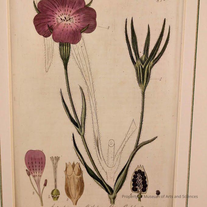 Purple flower on green stem at center with stem and bud on right. Line drawing of the leaf behind flower. Below across the bottom are five drawings of flower parts.Artwork Details