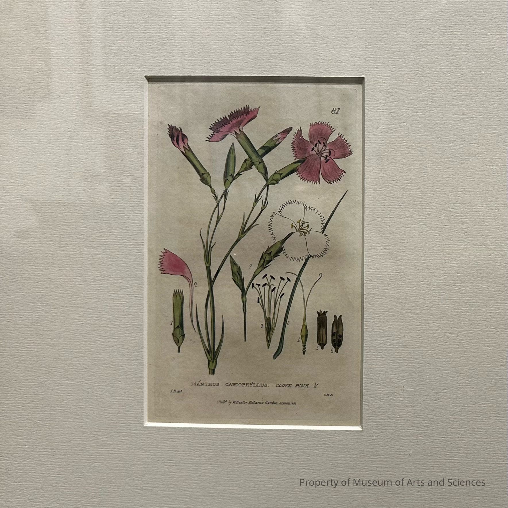 There is a central drawing of the stem with leaves and pink flowers. There are five colored smaller drawings of the flower parts at the bottom.Artwork Details