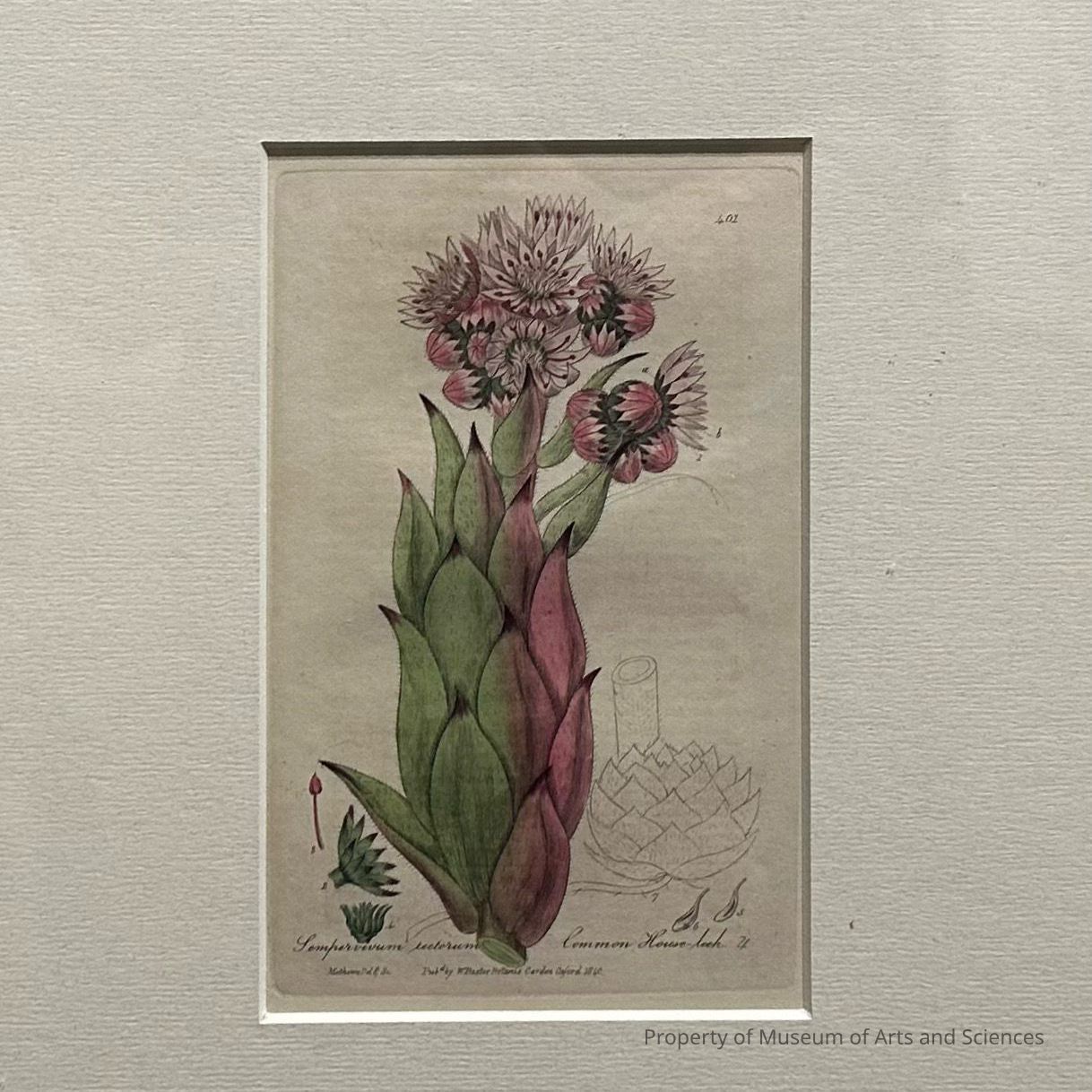 There is a central drawing of the green and pink stem and leaves with pink and white flowers. At the bottom right is a line drawing of a leek. At the bottom left are three drawings of pink and green flower parts.Artwork Details