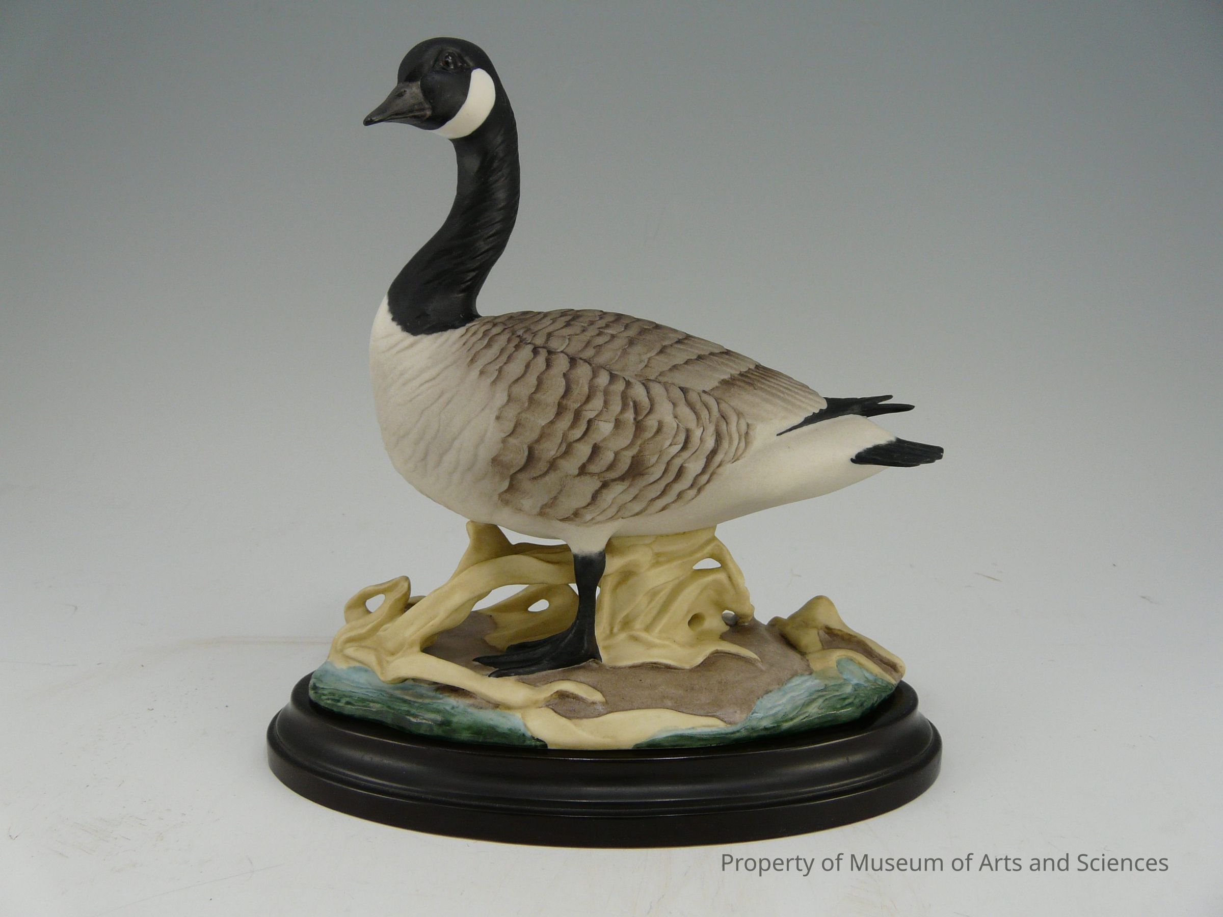 Male is standing with his head erect but turned inquisitively to his proper left side. Goose stands on a beige, brown and green oval base with a separate oval base designed to imitate lacquered wood. The work is stamped on the base and reads: Boehm/Canada