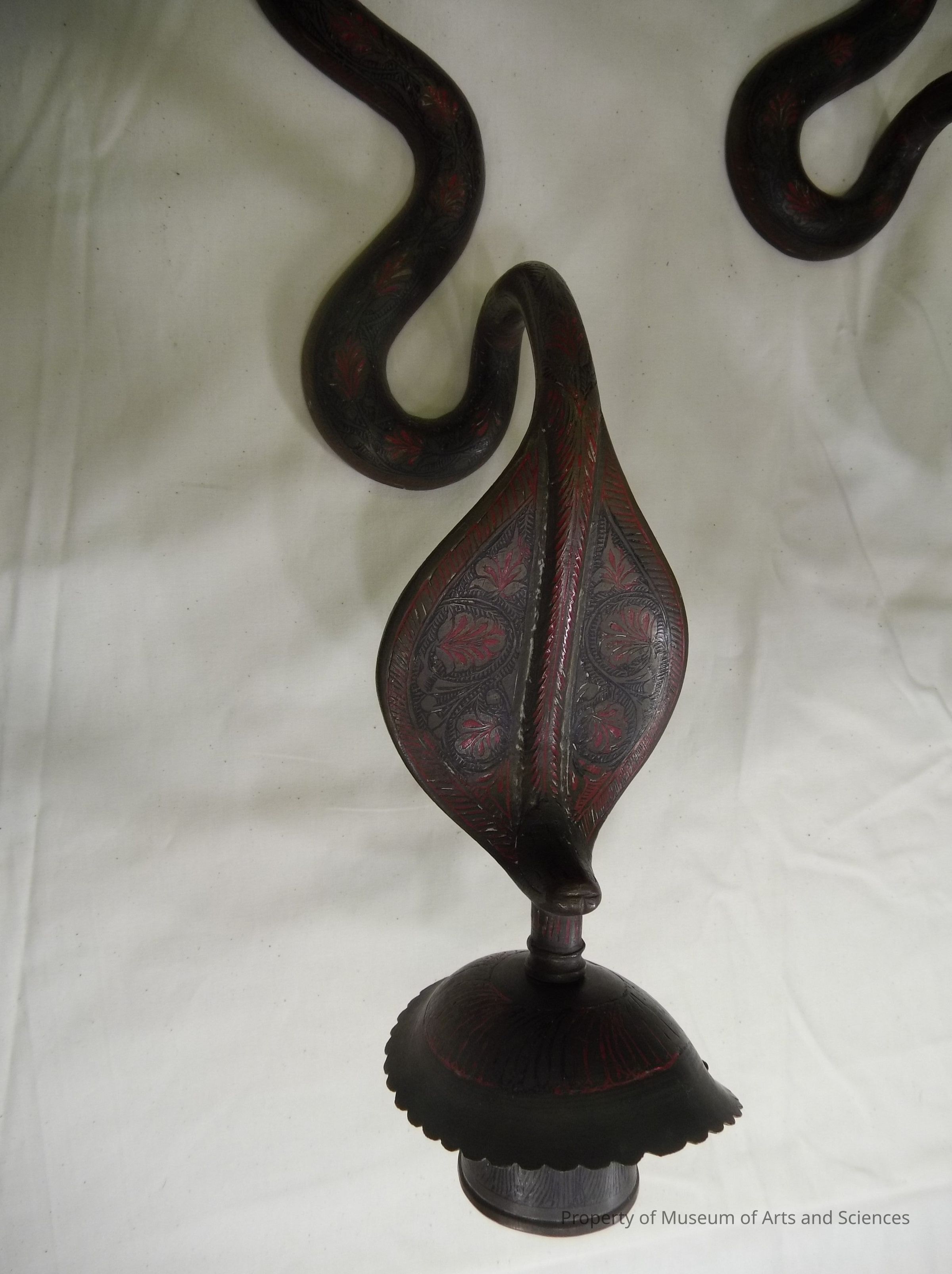 B:Bronze cobra candlesticks with engraving and red and black lacquer, bronze with flower and arabesque design engraved and filled with red and black lacquer, caandelholder at head of cobra, long curled tail.Artwork Details