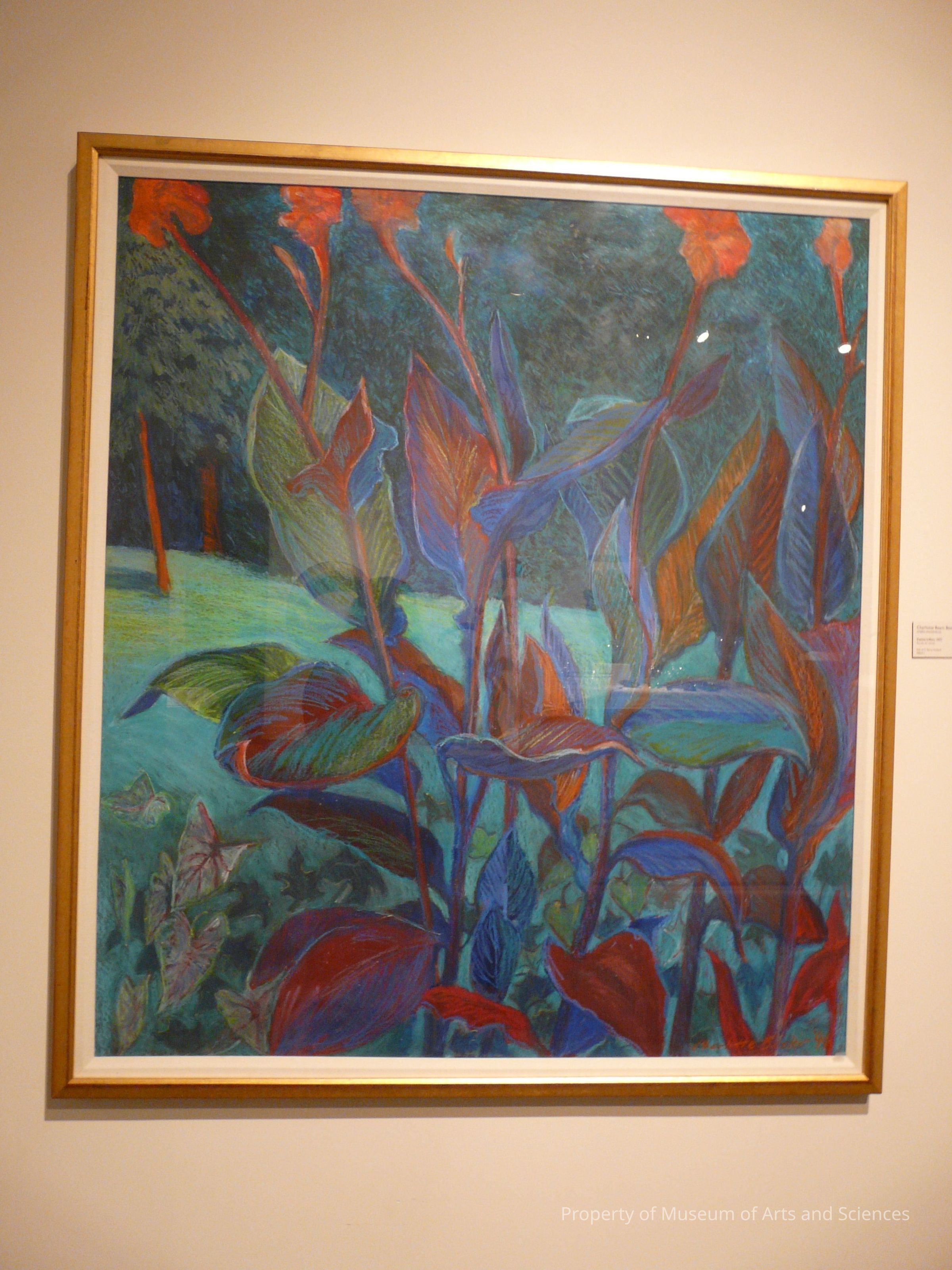 Blooming canna lilies in a garden executed in blues and greens accented by orange blooms.Collection