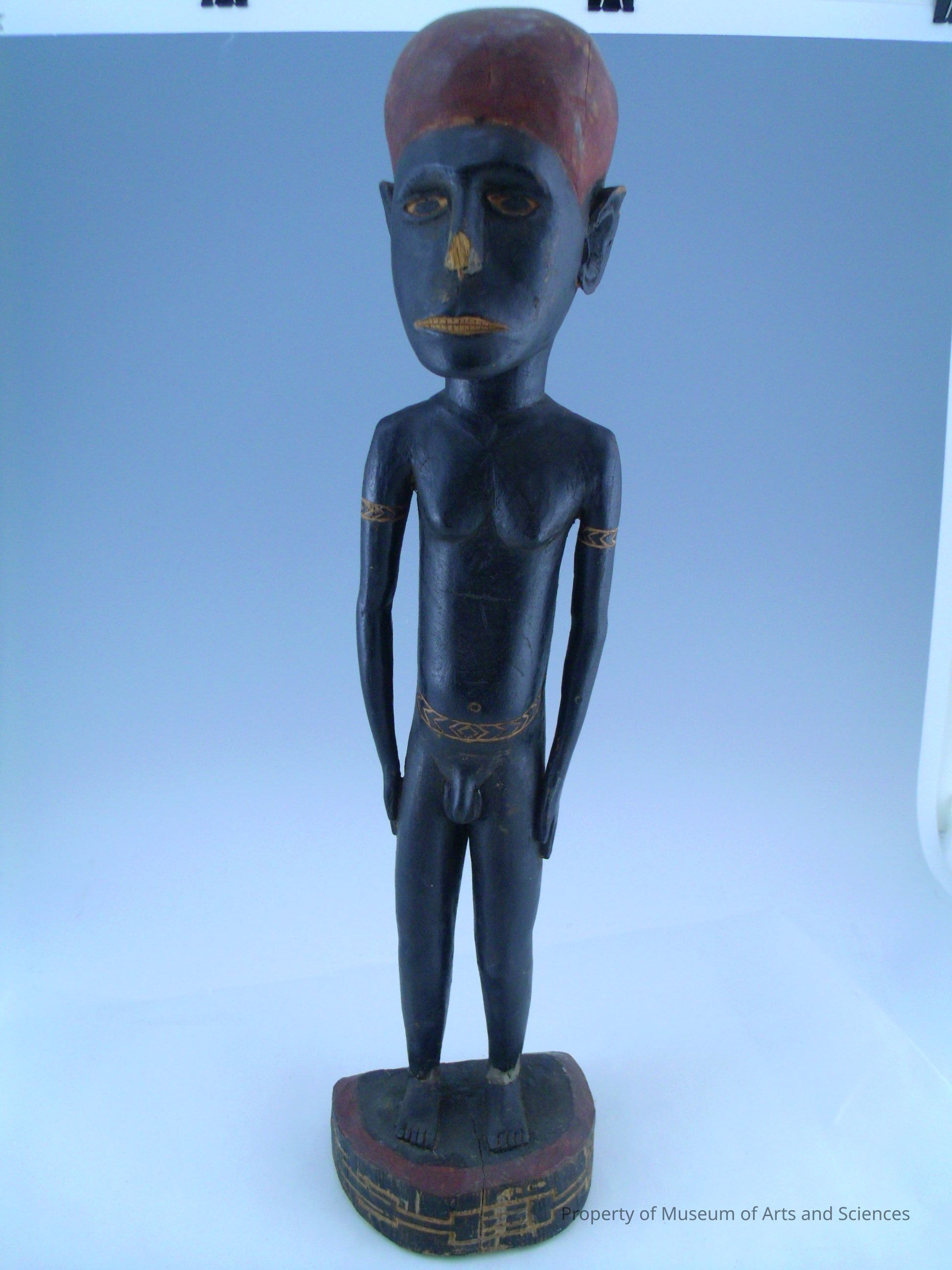 New guinean hood painted ebony, standing on base. Carved design around base, waiste and arms. Red headdress, stick through nose teeth showing.