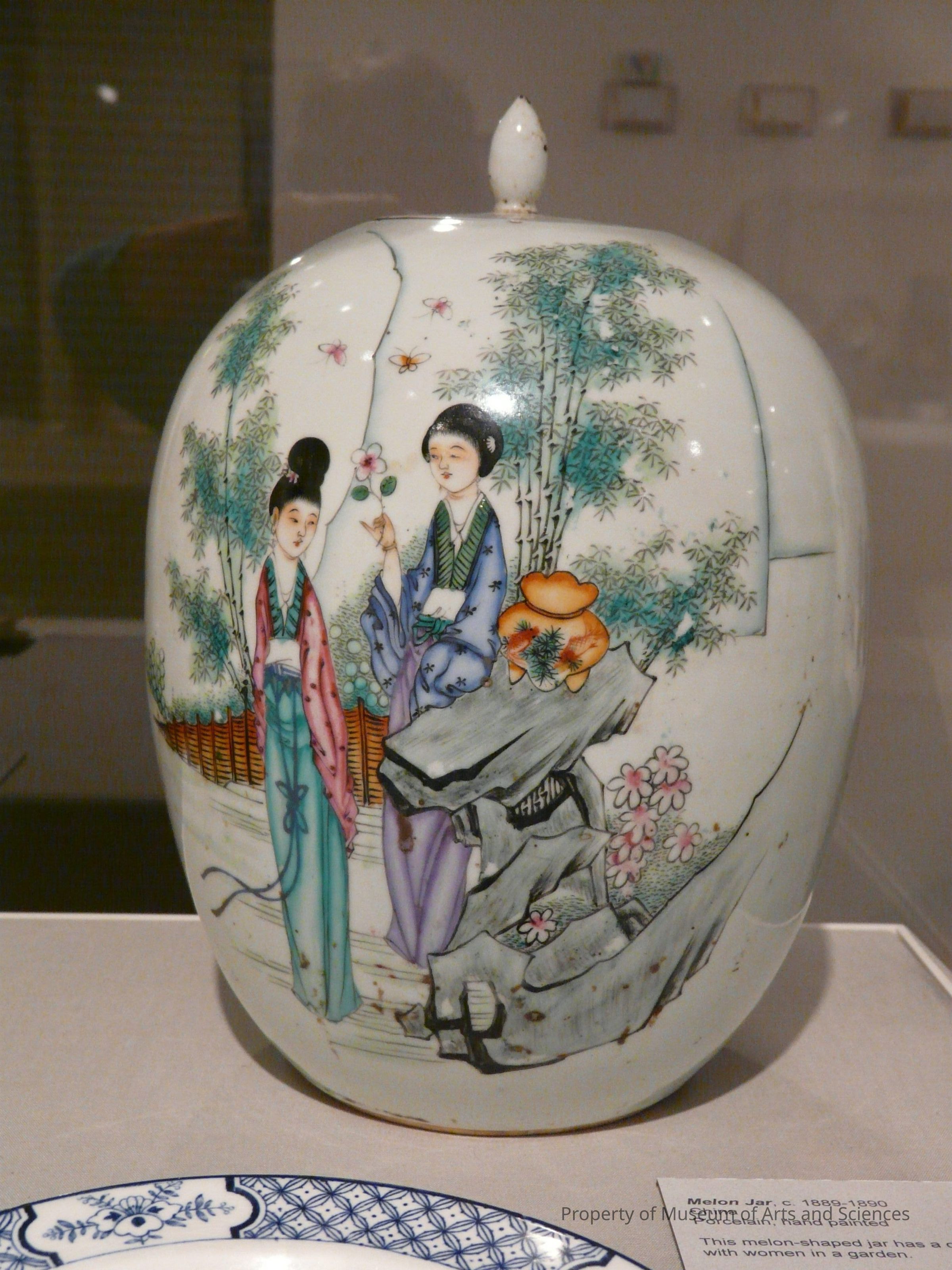 One of a pair of Chinese melon shaped porcelian jars with a lid surmounted by an acorn finial. The body is decorated withtwo women in a garden and a stone seat on the obverse while the reverse has several vertical lines of inscriptions. Body is a; lid iCollection
