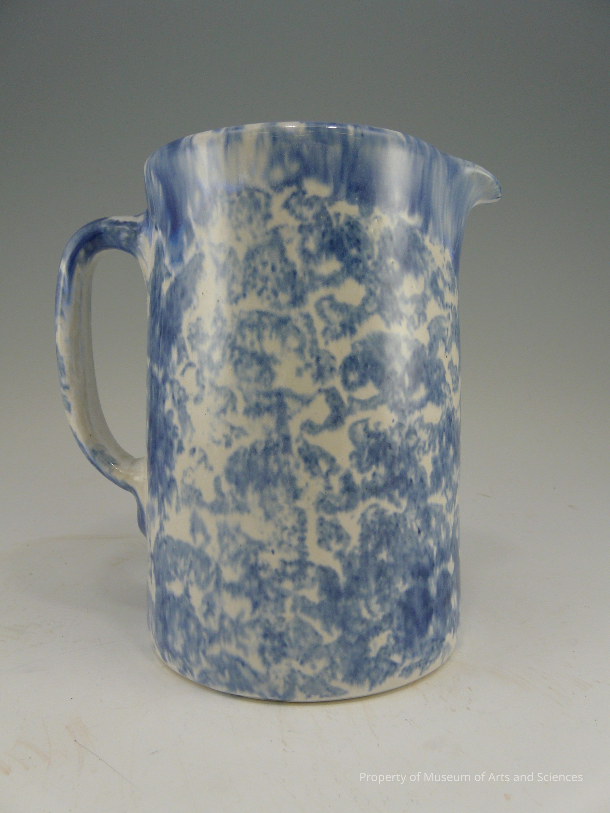 clay W. J. Gordy 1989; pitcher with blue and white sponged feldspathic glaze