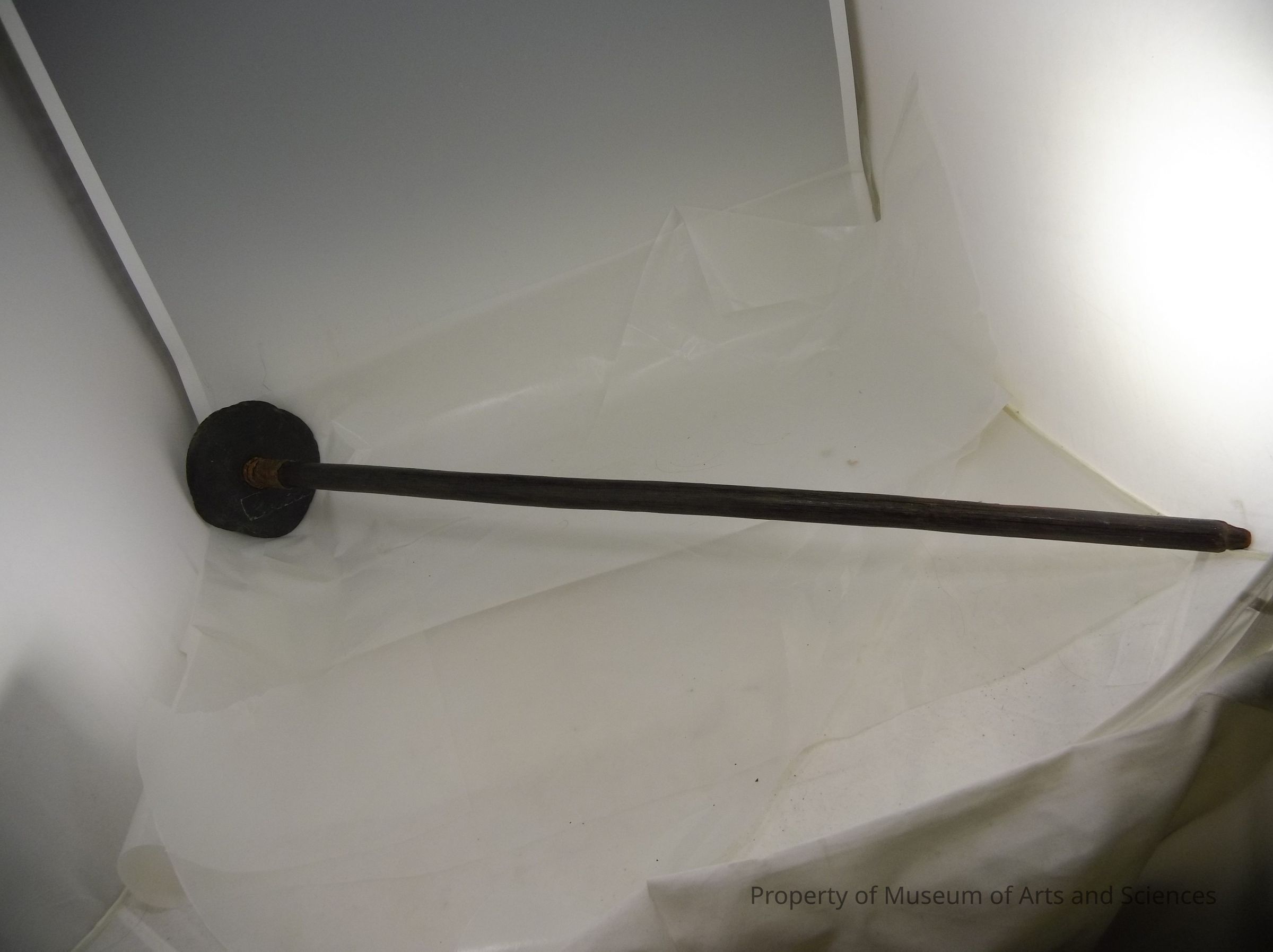 Dark Brown wood painted at one endwith rattau binding at top, round slate disc about 3" from top